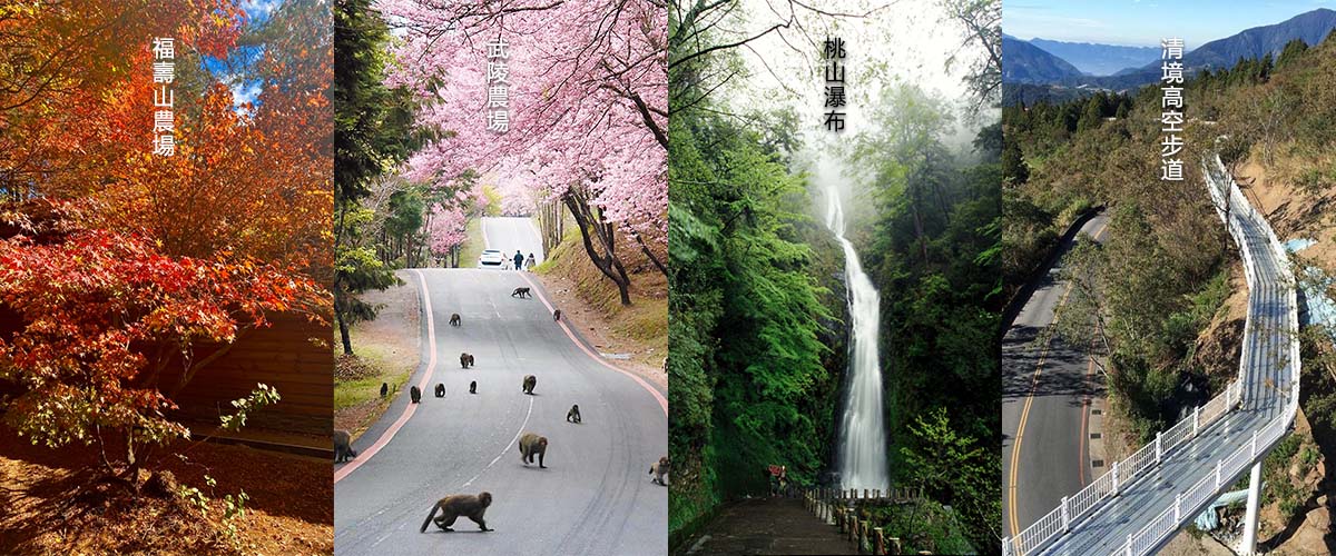 武陵農場位於台中市和平區平等村、七家灣溪畔的谷地中,武陵農場是國寶魚櫻花鉤吻鮭的家鄉,以盛產梨、蘋果、水蜜桃及夏季蔬菜、高山茶等高山農場品聞名,武陵農場一年四季景象迴異,處處瀰漫著果香、菜香、清新的空氣,讓您在武陵農場恍若身在世外桃源。
