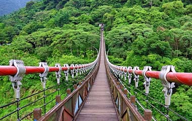跨越曾文溪的福美吊橋,是全台第三座俗稱吊床式吊橋,橋長一七五公尺,是全台最長「天梯」吊橋!橋身以鄒族的紅、藍、黑三色為主,吊橋兩端分別有由山美部落小朋友創作的彩繪馬賽克鄒族神話,橋下曾文溪谷風光呈現多樣的地質景觀!